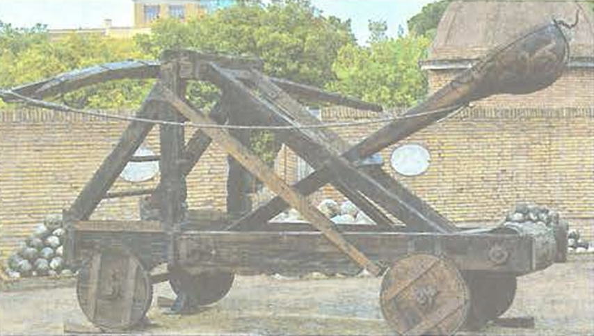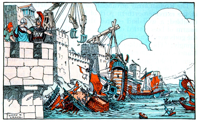 Для обороны своего города он создал небывалые военные машины: это были катапульты, метавшие камни на огромные расстояния; подъёмные краны с крючьями, которые цепляли римские корабли и топили их в гавани. Дошло до того, что солдаты Марцелла в ужасе разбегались, как только видели над крепостной стеной верёвку или бревно!