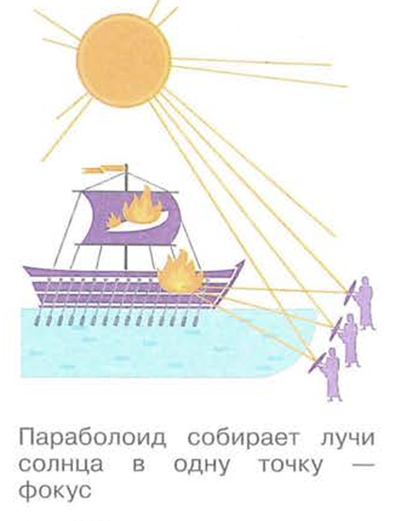 Существует даже легенда о том, что Архимед установил на крепостных стенах множество зеркал и с помощью силы солнца поджигал ими римские корабли. Многие потом сомневались, что это в принципе было возможно. Однако к тому времени греки уже знали об удивительном свойстве зеркального параболоида собирать солнечный свет в одной точке - фокусе.