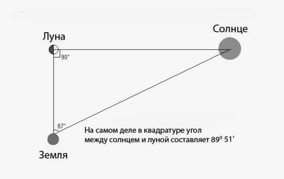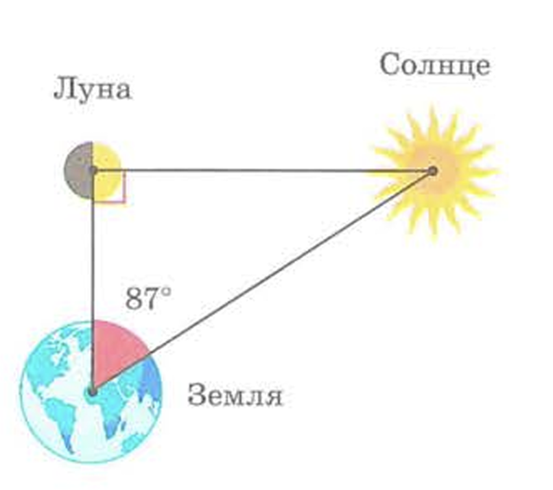В это время он измерил угол между Луной и Солнцем и получил 87 градусов. Аристарх понял, что ровно половина Луны может быть видна с Земли только тогда, когда направления на неё с Земли и Солнца образуют прямой угол. Астрономы называют это положение квадратурой.