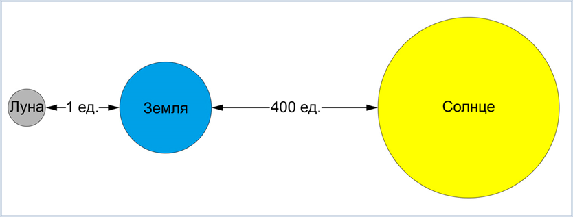 - Отношение расстояний от Земли до Солнца и от Земли до Луны примерно равно 1/400